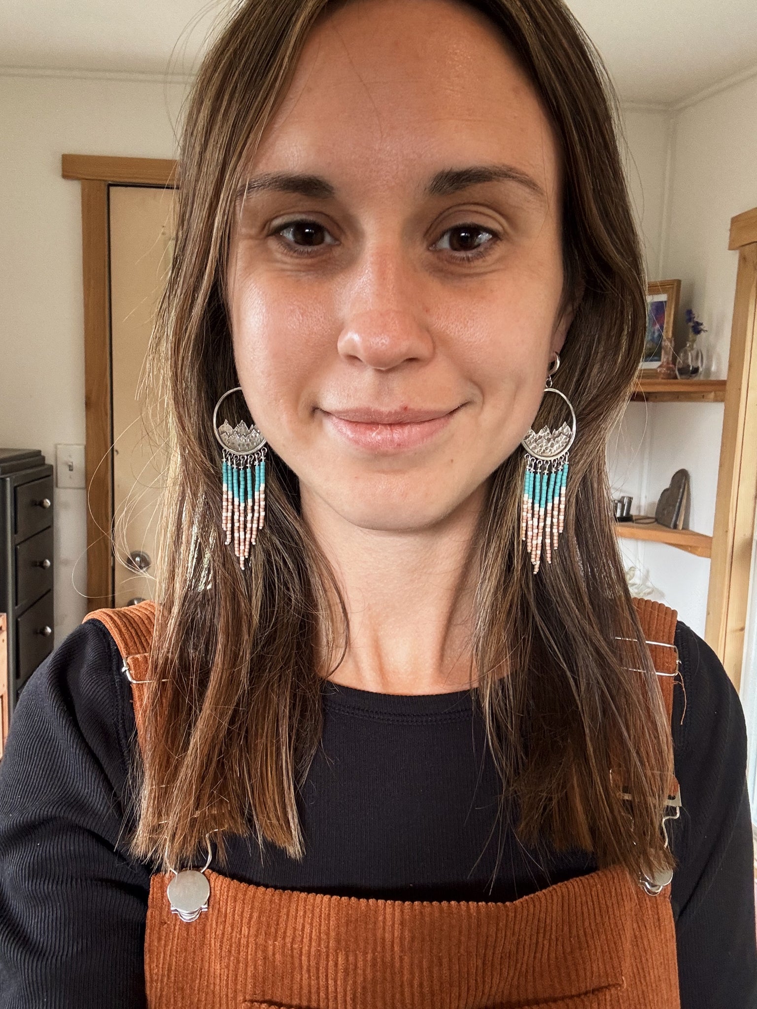 The beaded mountainscape dangles are a new design that I have debuted this month, after many months of tinkering with their design. They combine some of my most favorite earring styles all in one. The mountainscapes are made from two layers of hand sawed and textured sterling silver. Dangling below this mountainscape scene are vibrant japanese seed beads strung on a sterling silver wire. The bead dangles don’t bend and hang straight down.