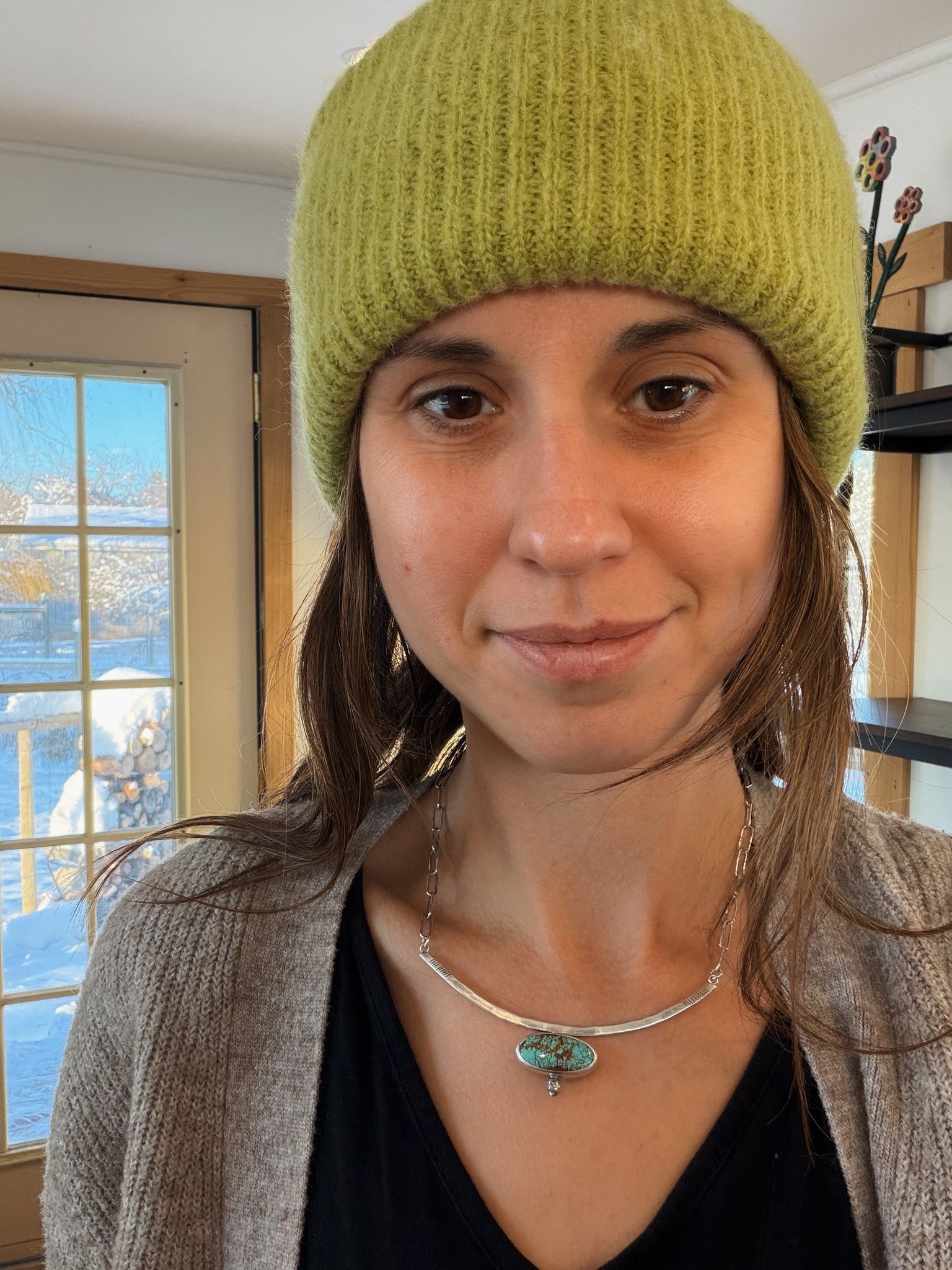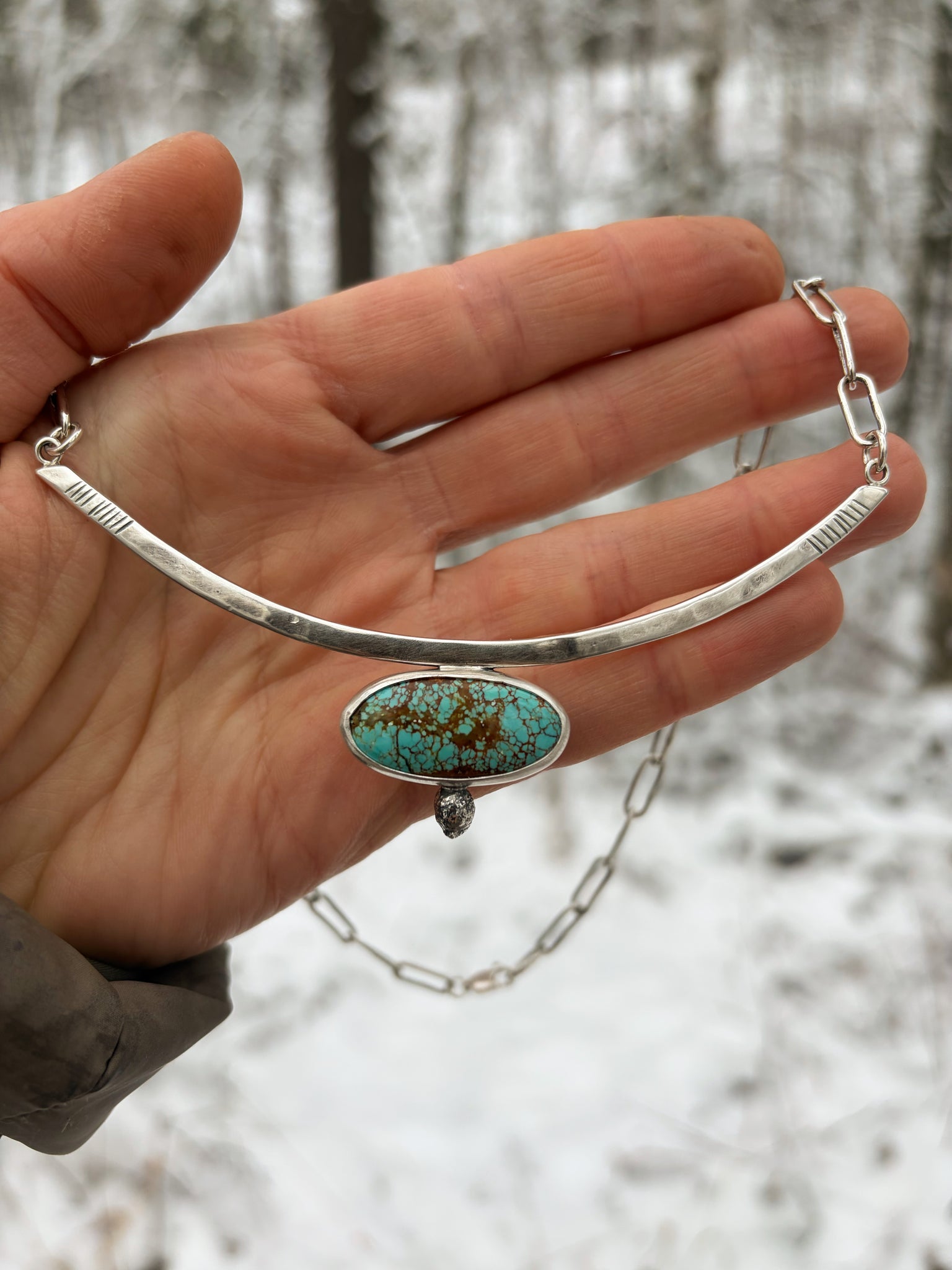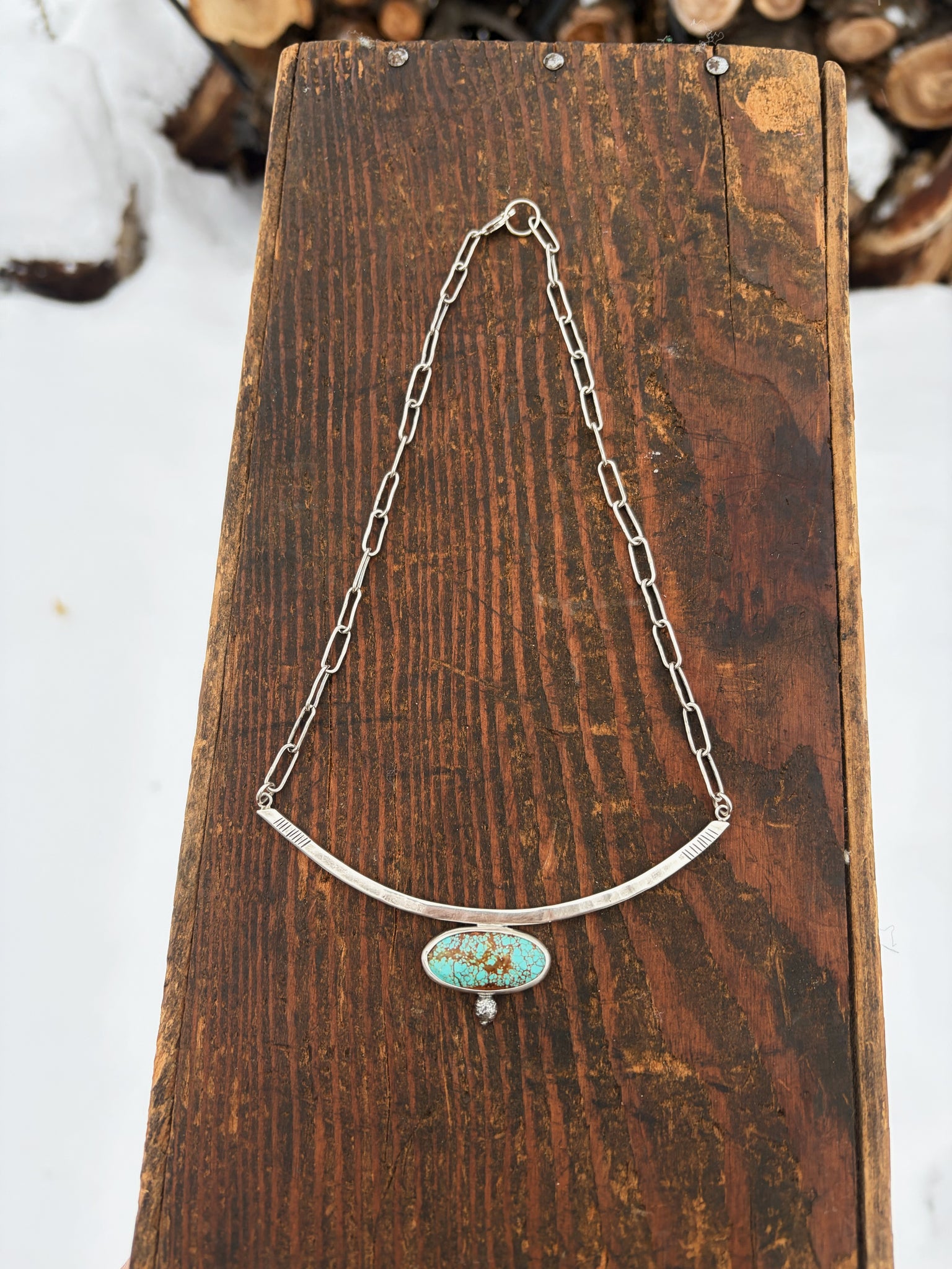 It features an absolutely stunning chunk of Royston Turquoise set in sterling silver. I picked up this Turquoise in Tucson last February and have been waiting for it to find it's perfect design. This pendant is soldered to thick rectangular silver wire that stretches across your chest 4 inches in diameter. There are stamping accents on each side of this wire. This piece hangs from a handmade paperclip chain. The chain is chunky, durable, and each link was made with love.