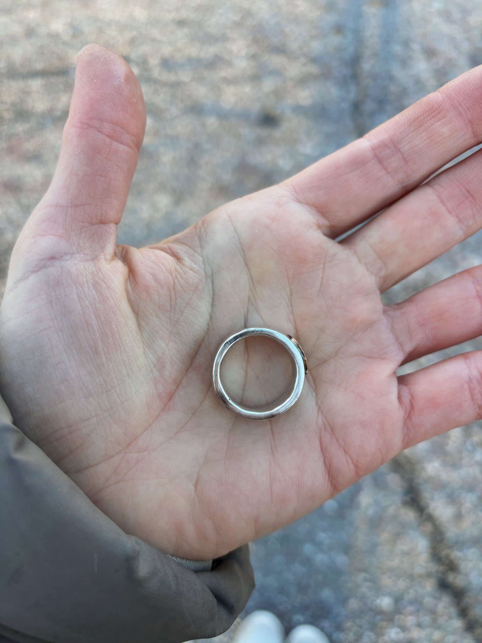 This ring is hefty and weighty. It feels good on your hand. On the front of the ring band is a 14 karat goldfill hand sawed bear.