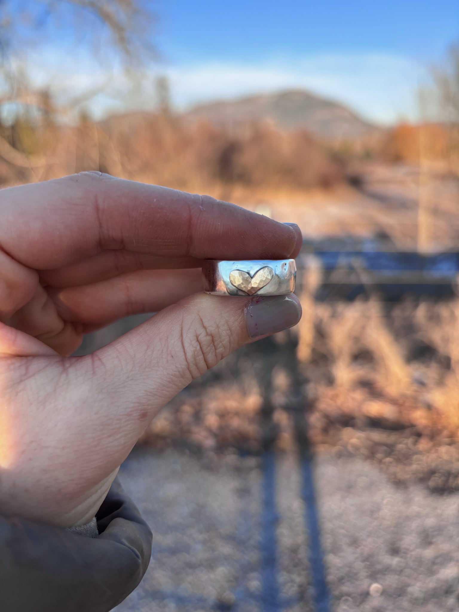 This ring is hefty and weighty. It feels good on your hand. On the front of the ring band is a 14 karat goldfill hand sawed heart.
