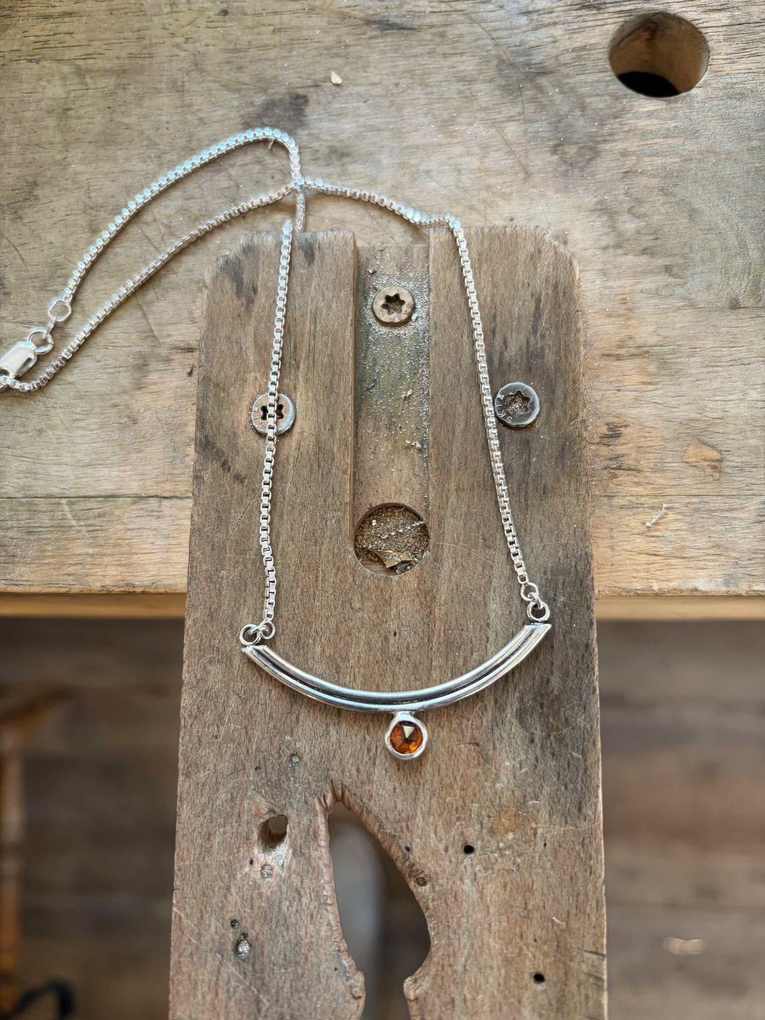 The bow necklace pairs a minimalist design with a stunning facetted orange imperial topaz stone.