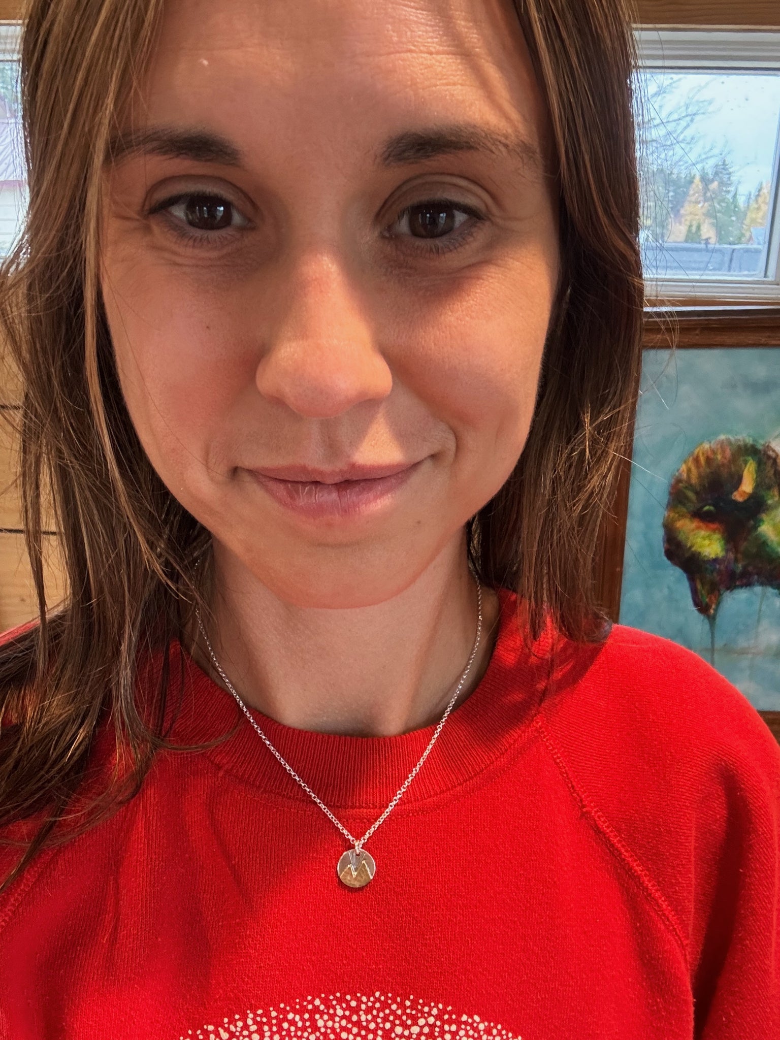 Mountainscape Necklace is made from a sterling silver round and hand sawed and hammered brass mountains. It is inspired by the rugged Rocky Mountain landscape that greets us here in Northwest Montana. This necklace is made to last and perfect for all occasions.