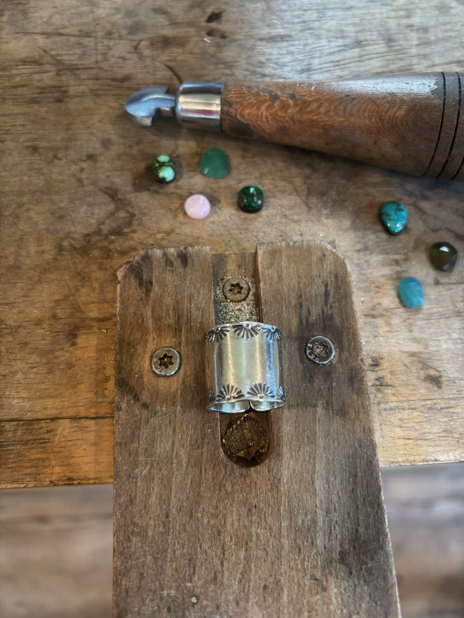 My newest collection of bandana slides are bound to be your go-to accessory. I am falling more in love with wearing scarves and bandanas everyday, but I haven't quite perfected the knot. This slide is easy to use and will not fall off. It's made from sterling silver and features hand stamped flower accents. The slide measures 3/4 an inch tall.