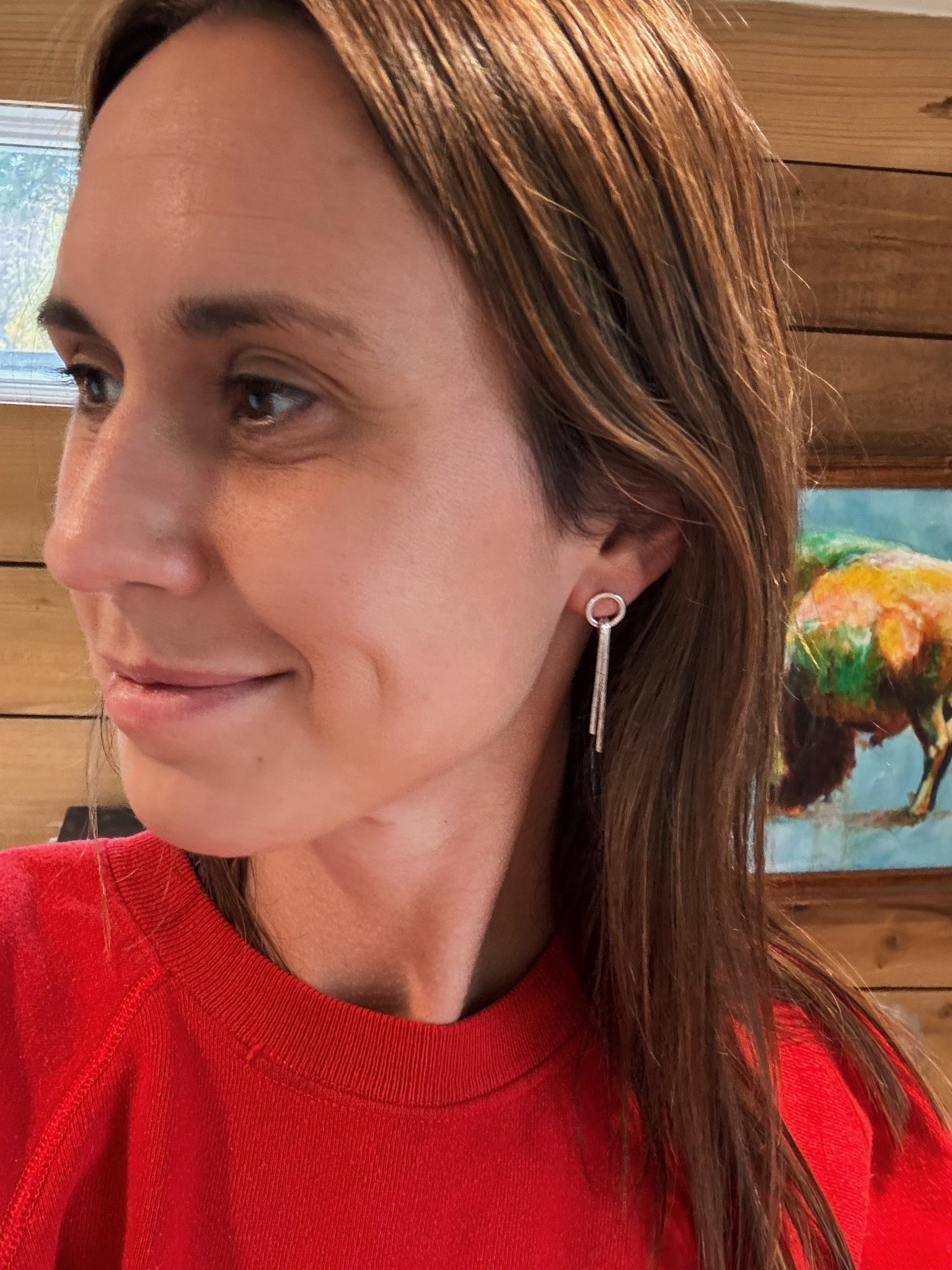 Each earring is hand crafted with sterling silver circle stud. Two hammered sterling wires dangle below.