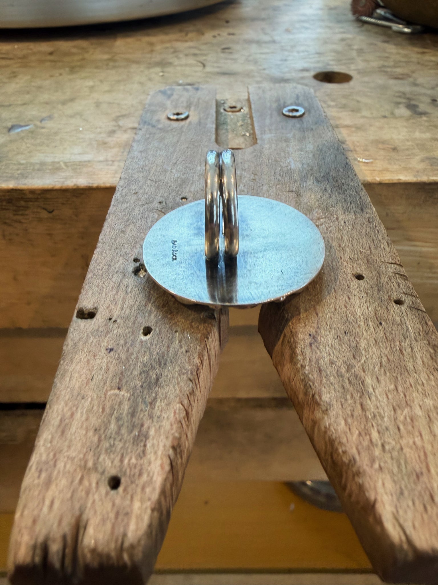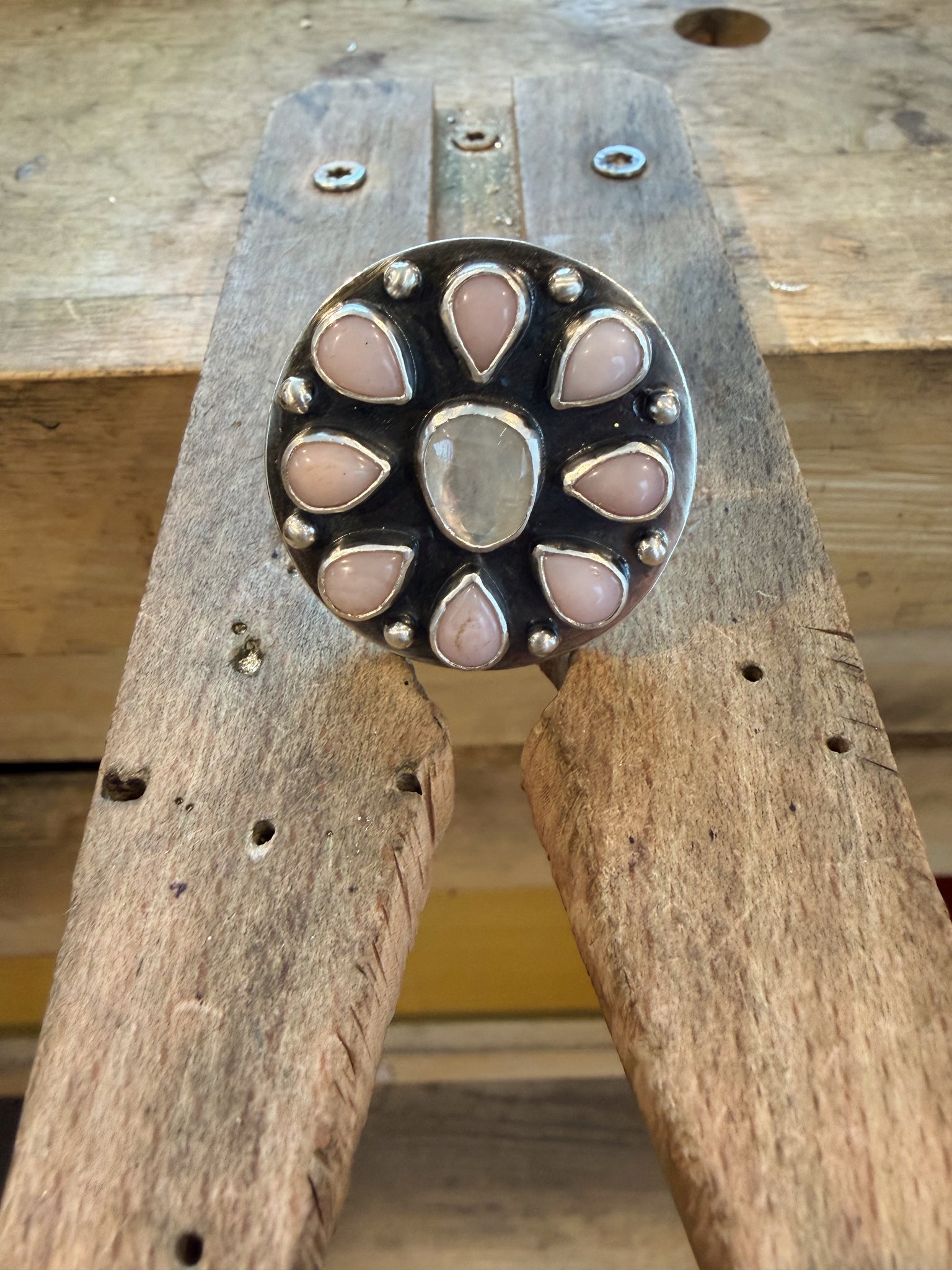 The Montana Sunrise ring is an incredible one of a kind piece. It features tear drop cuts of milky pink Peruvian Opals and one stunning facetted rainbow Moonstone in the middle. There are recycled silver ball accents around each pink opal stone. The ring band is split shank, made from two half round wires. This piece is all silver, and there is a patina on the the top surface of the ring which makes the silver a darker color.