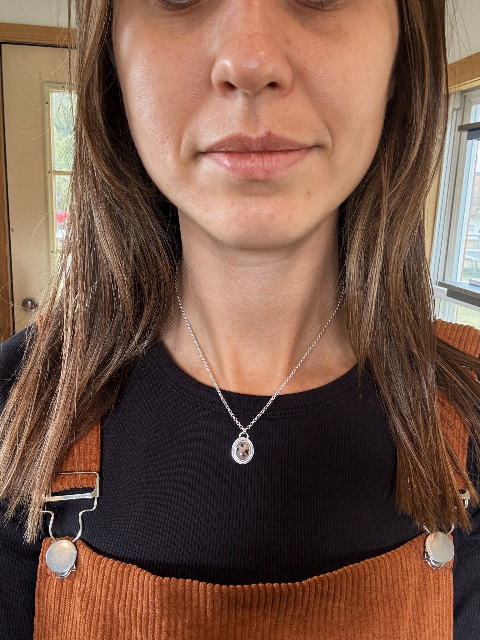 Each pendant features a unique MT agate set in two layers of sterling silver. It is strung on a 16 inch sterling silver round rolo chain. Comfortable, stylish, and perfect for all of your adventures this season!
