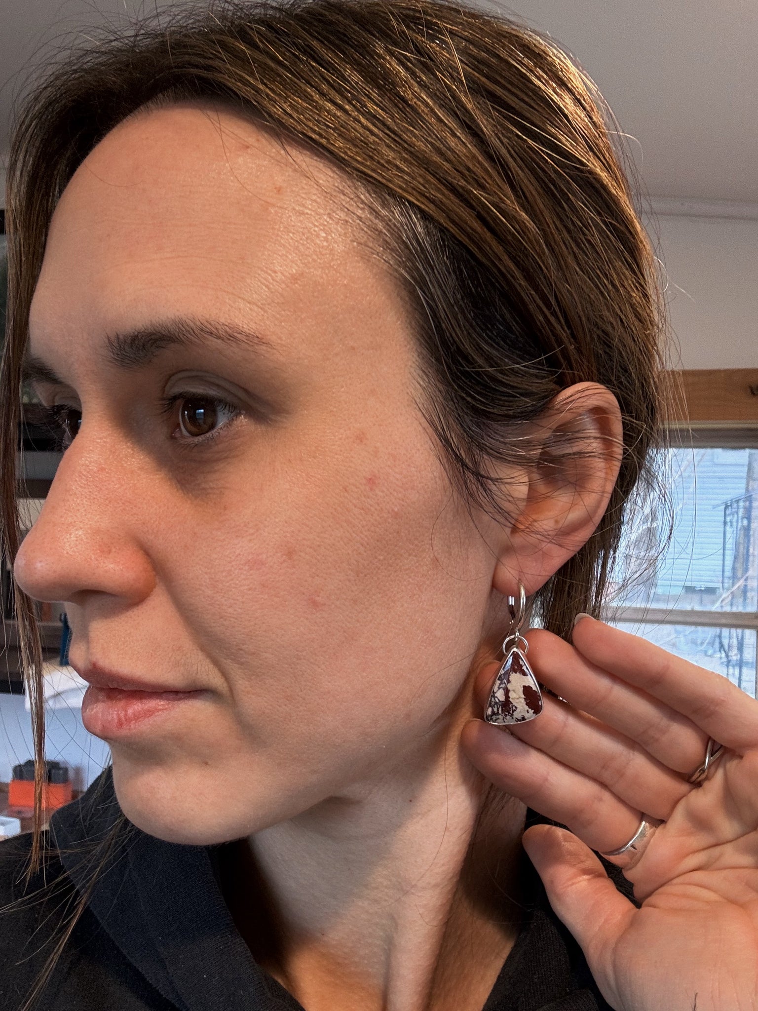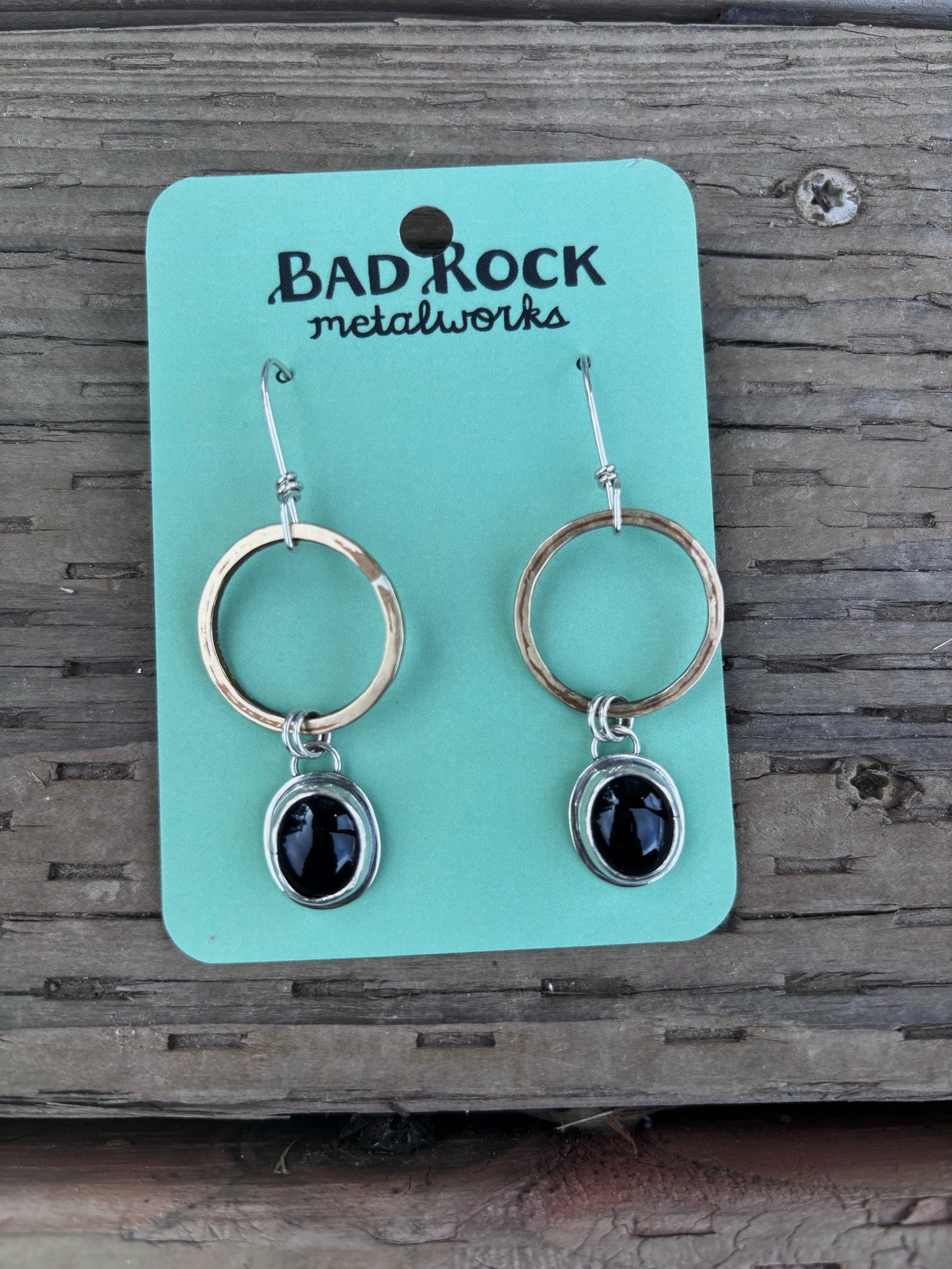 These hoop dangles feature hefty 14 karat goldfill hoops. Dangling below is a shiny slice of onyx set in sterling silver. Built to last and made with love!