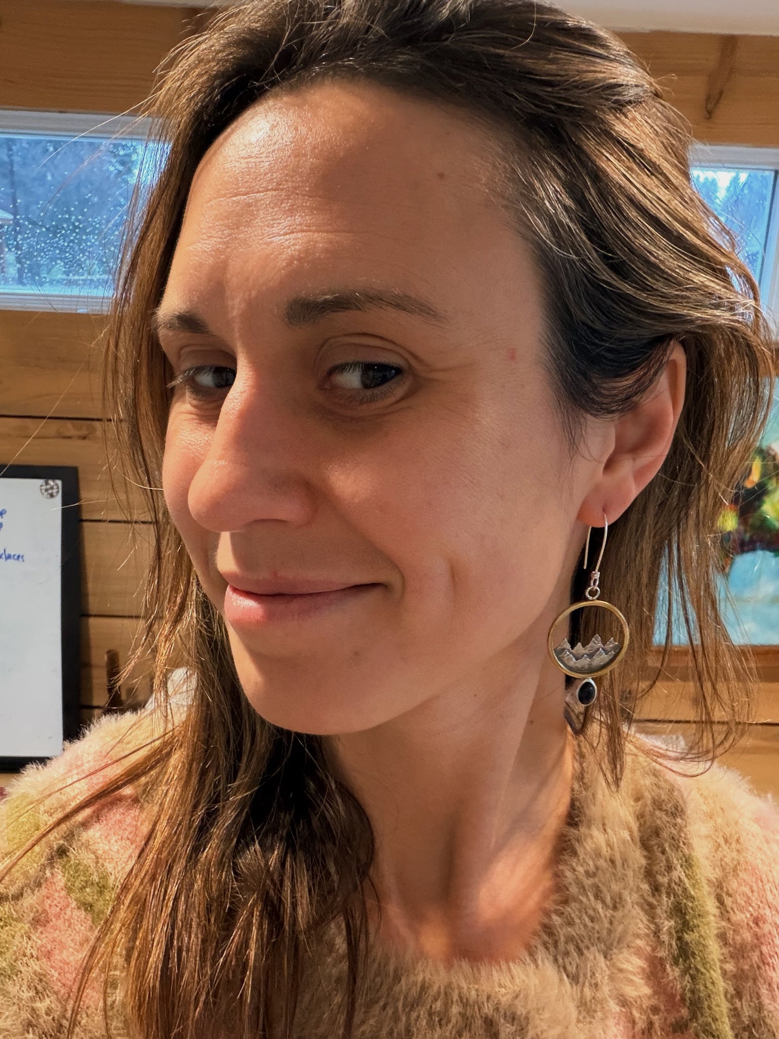 These Onyx mountainscape dangles are going to be your next favorite pair of earrings! They feature silver hand sawed and textured mountains, with a thick brass wire around them. Below each dangle hangs a sleek black oval slice of Onyx.