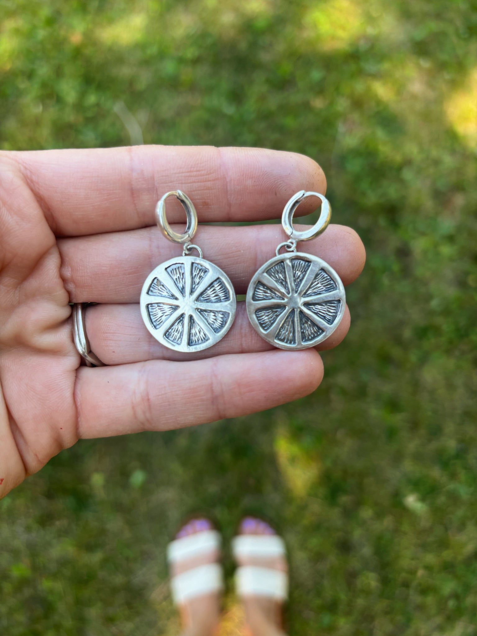 Hand crafted orange slices in SILVER! These little huggies are fun, whimsical, and perfect for a fruit lover! Each earring is hand sawed, stamped, and polished to create two perfectly imperfect orange slices.