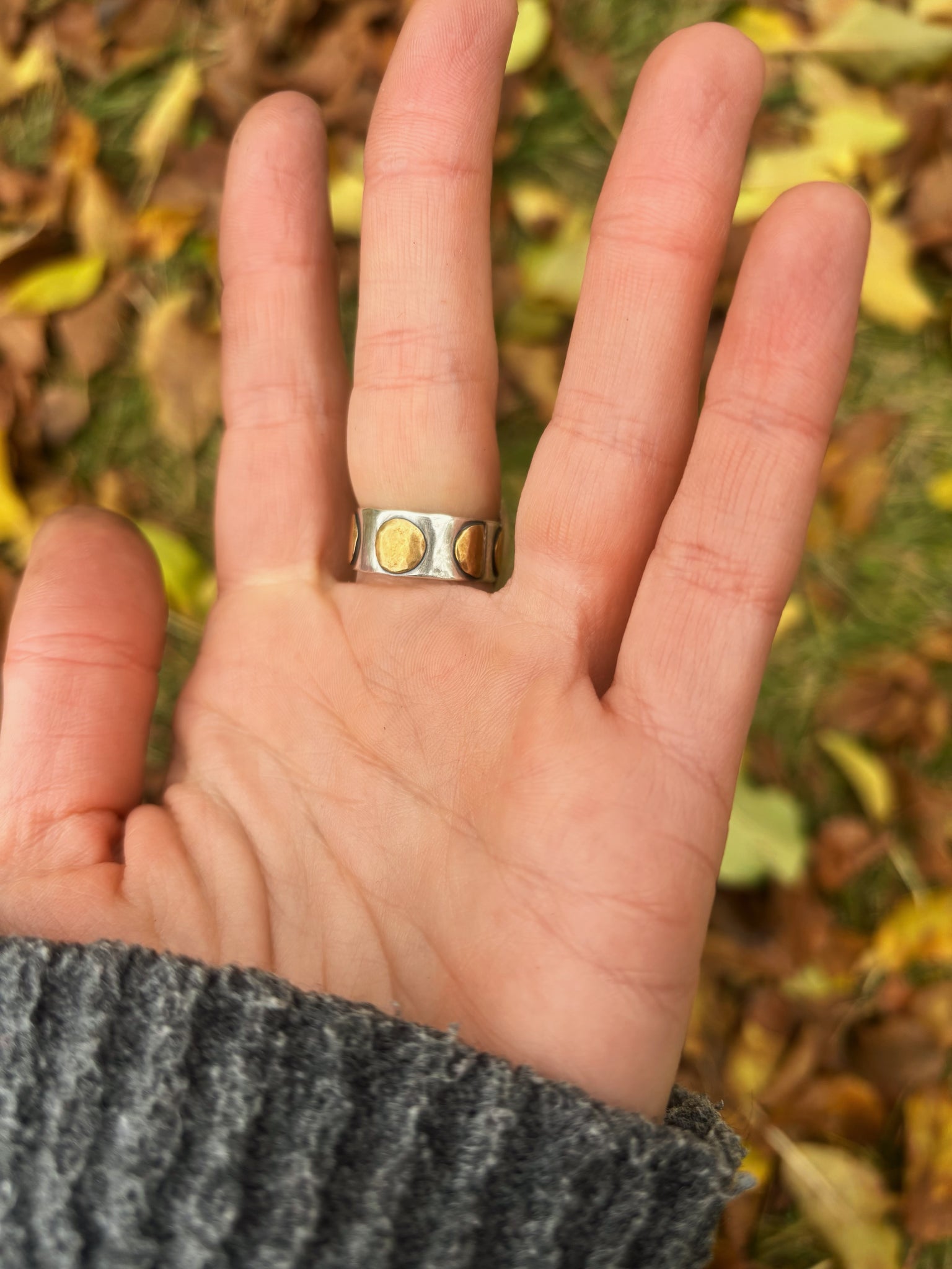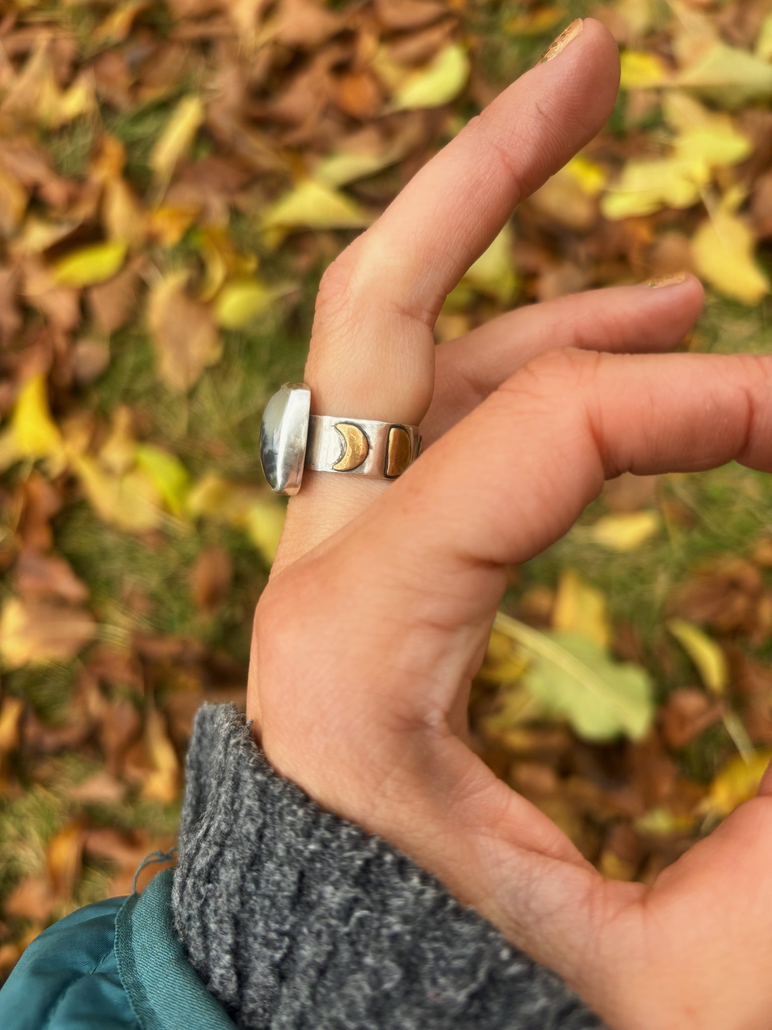 This Phases of the moon ring features a really beautiful dendritic agate set in sterling silver with brass accents. The stone setting is tight and simple to showcase this beautiful stone. The band is made from rectangular sterling silver and features hand sawed brass moon phases on the back of the band. The band measures a little over 1/4 an inch in diameter. The subtle details come together with this vibrant stone to make a beautiful piece.