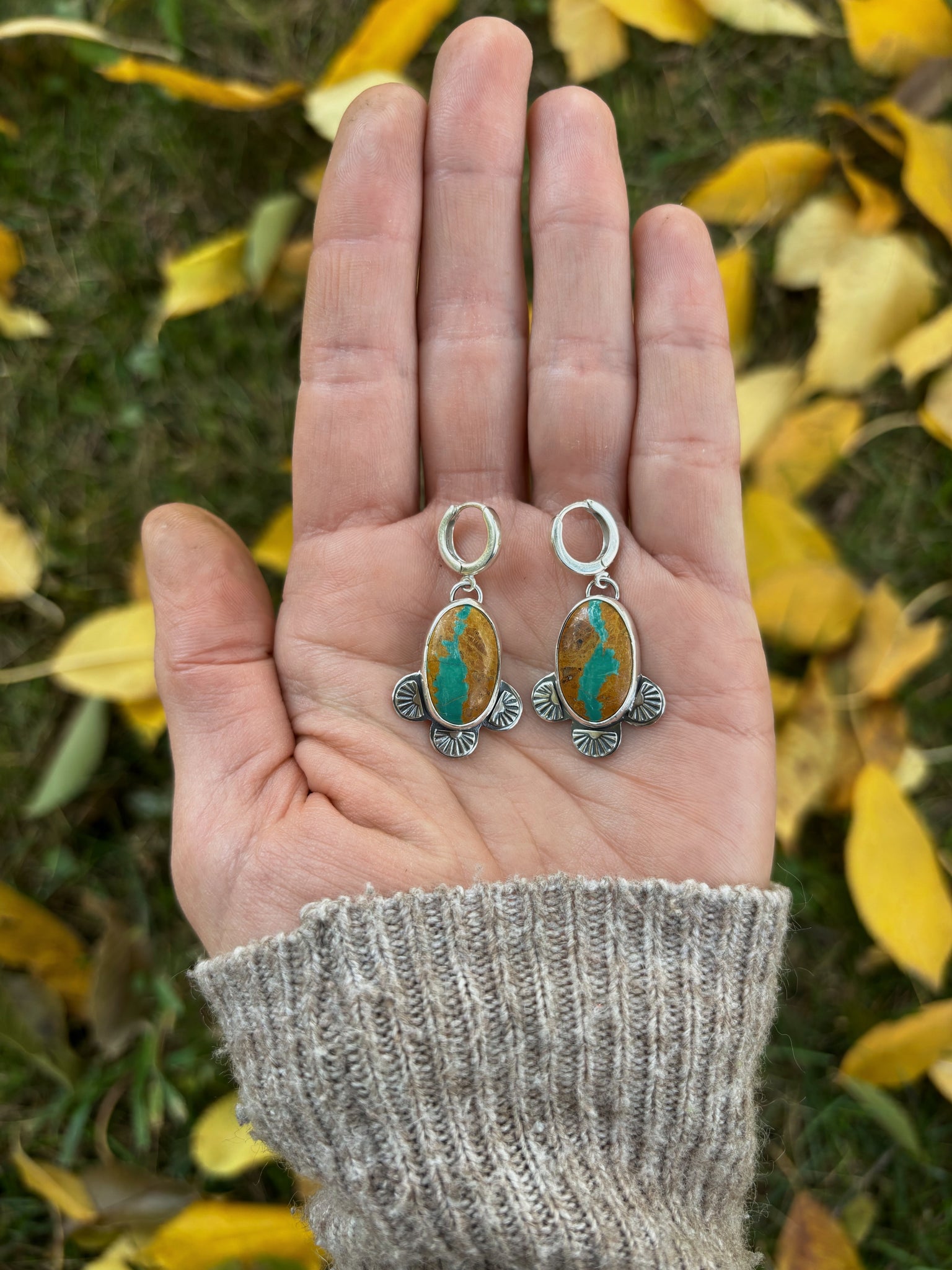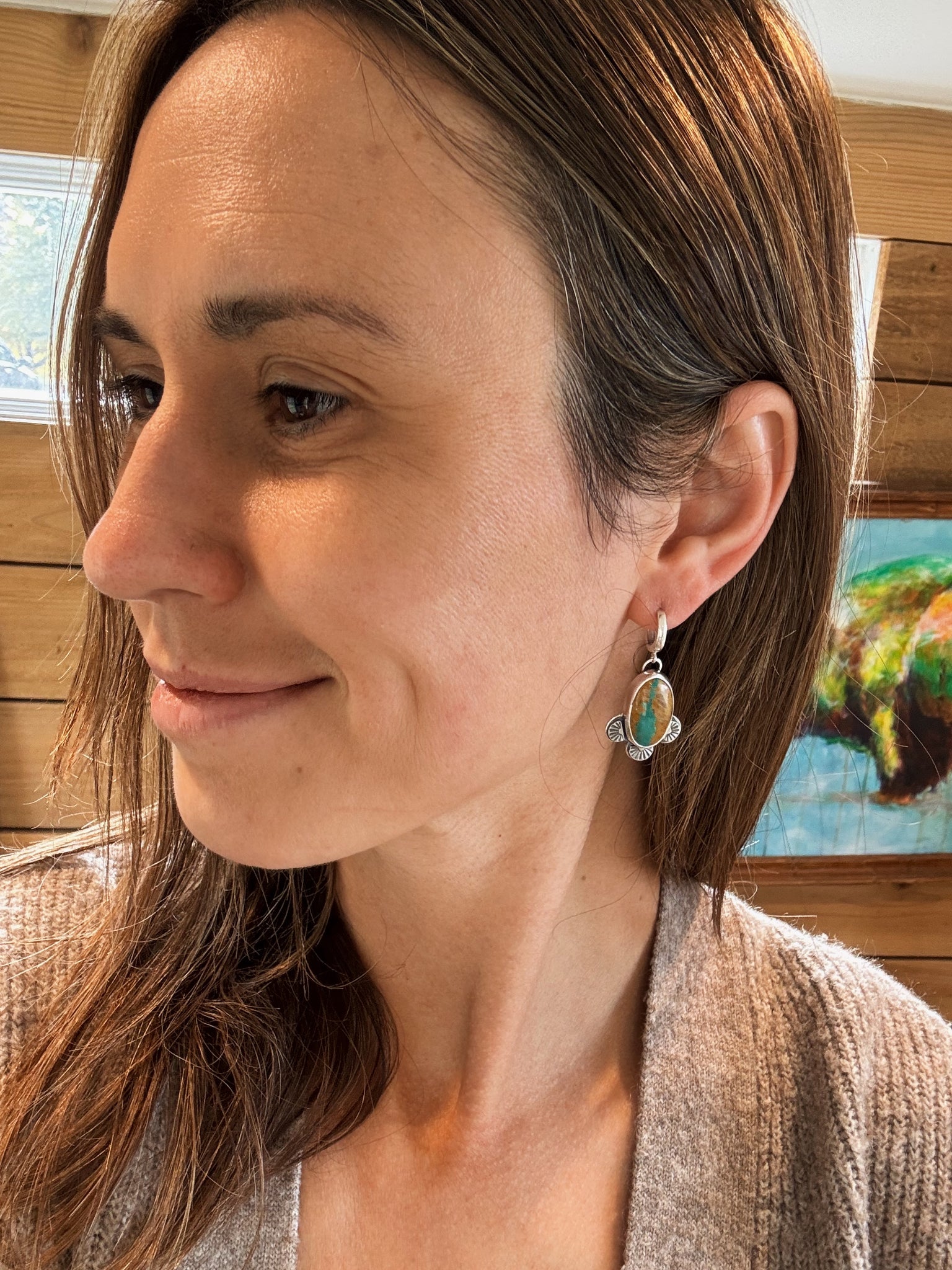Sweet, simple, and stunning! These earrings feature two gorgeous slices of American mined Royston Turquoise set in sterling silver. There are sterling silver stamped accents around the stone as well. The ear hook is a huggie so it has a lever back that closes completely.
