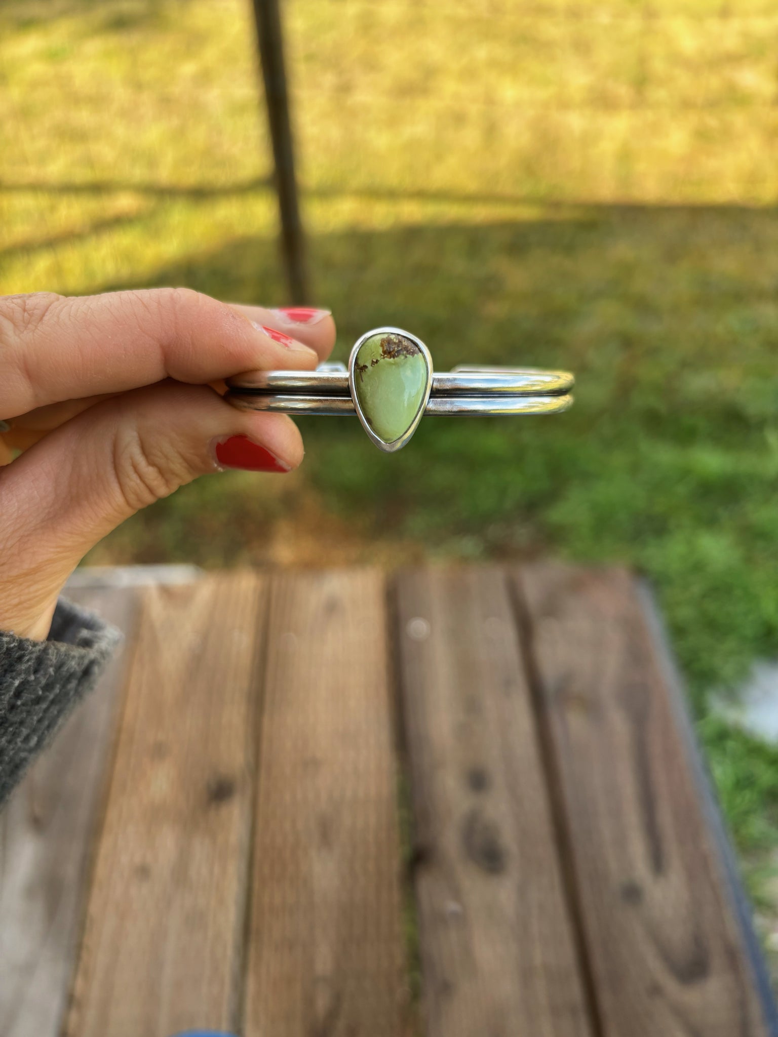 This cuff is made from thick sterling silver half round double banded cuff wire. It's very comfortable. The stone is a light green Royston Turquoise, also set in sterling silver.
