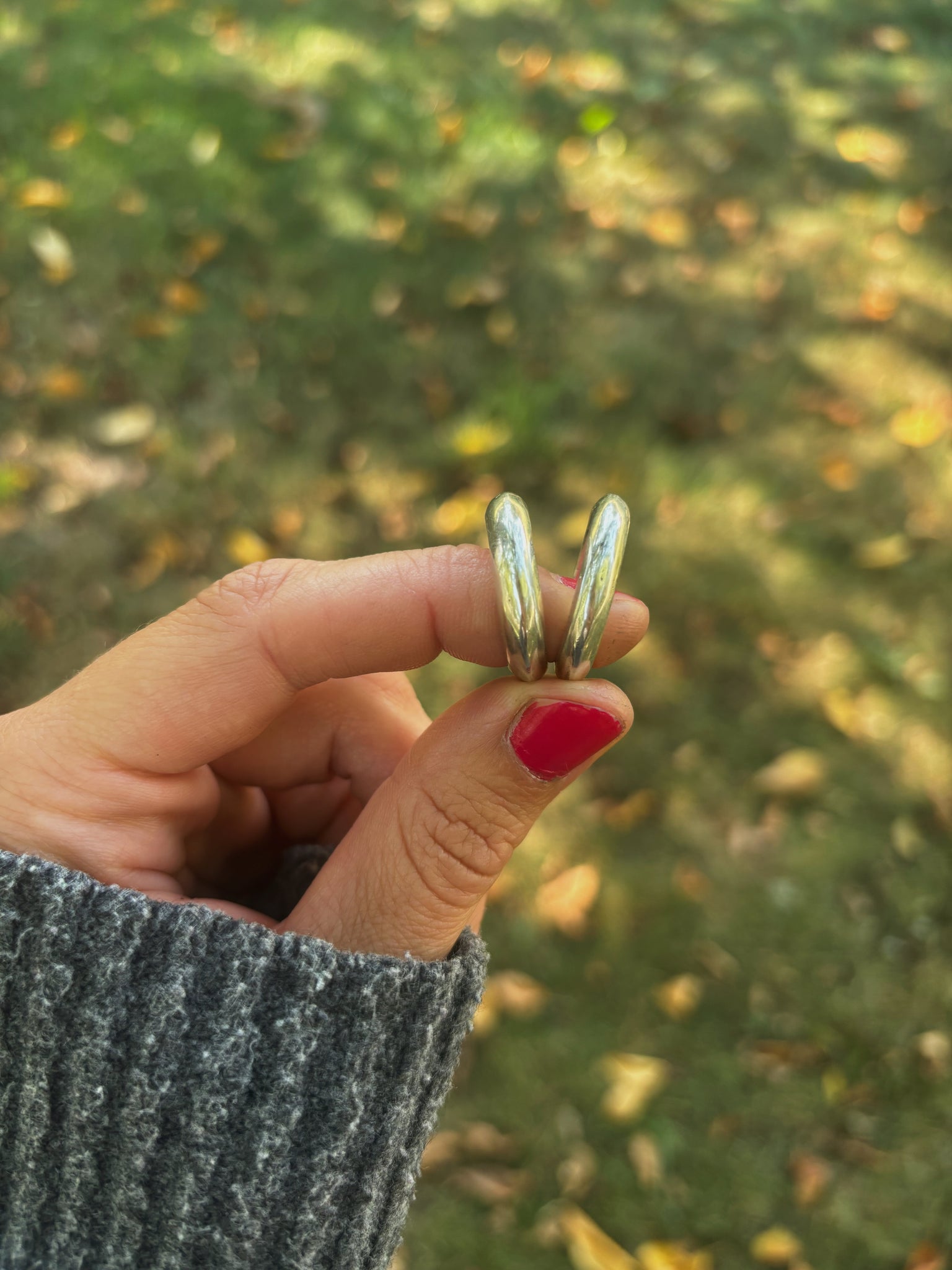 The saucer ring set features two thick sterling silver rings that fan out like a saucer. They are chunky and weighty. There is a light patina on each ring so that shadows and details pop.