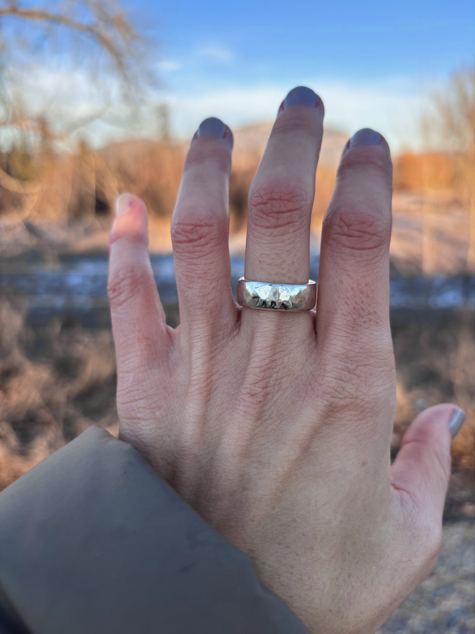 This ring is made through a special method of metalsmithing known as sand casting. A wax mold of the ring was hand carved by me, then placed in sand, removed, and the remaining form was filled with liquid hot sterling silver. The end result is a thick, chunky piece that has no solder joints, and is truly going to stand the test of time.