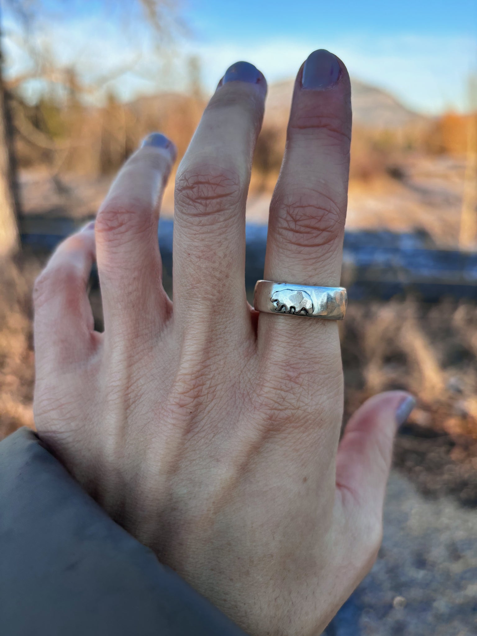 This ring is made through a special method of metalsmithing known as sand casting. A wax mold of the ring was hand carved by me, then placed in sand, removed, and the remaining form was filled with liquid hot sterling silver. The end result is a thick, chunky piece that has no solder joints, and is truly going to stand the test of time.