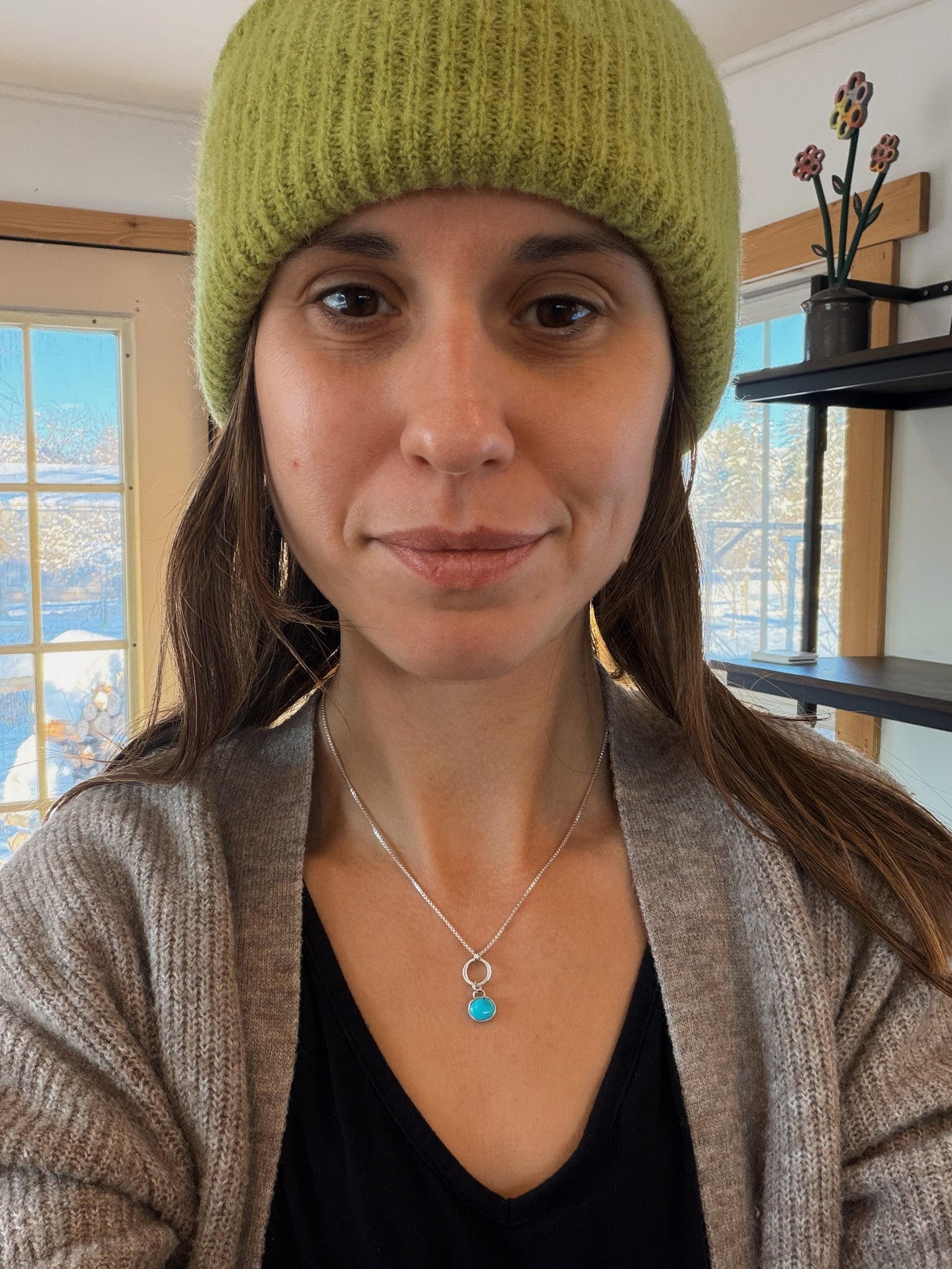 This piece features a stone pendant and a sterling silver hoop accent. It is strung on a petite venetian box chain. This chain is 16 inches long.