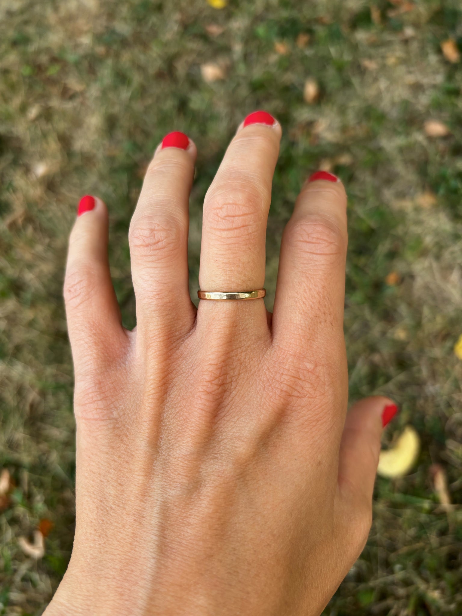 These simple stackers are made from half round 14 karat goldfill. They feature a hammered finish and are super comfortable to wear! Add them to other rings or wear solo.