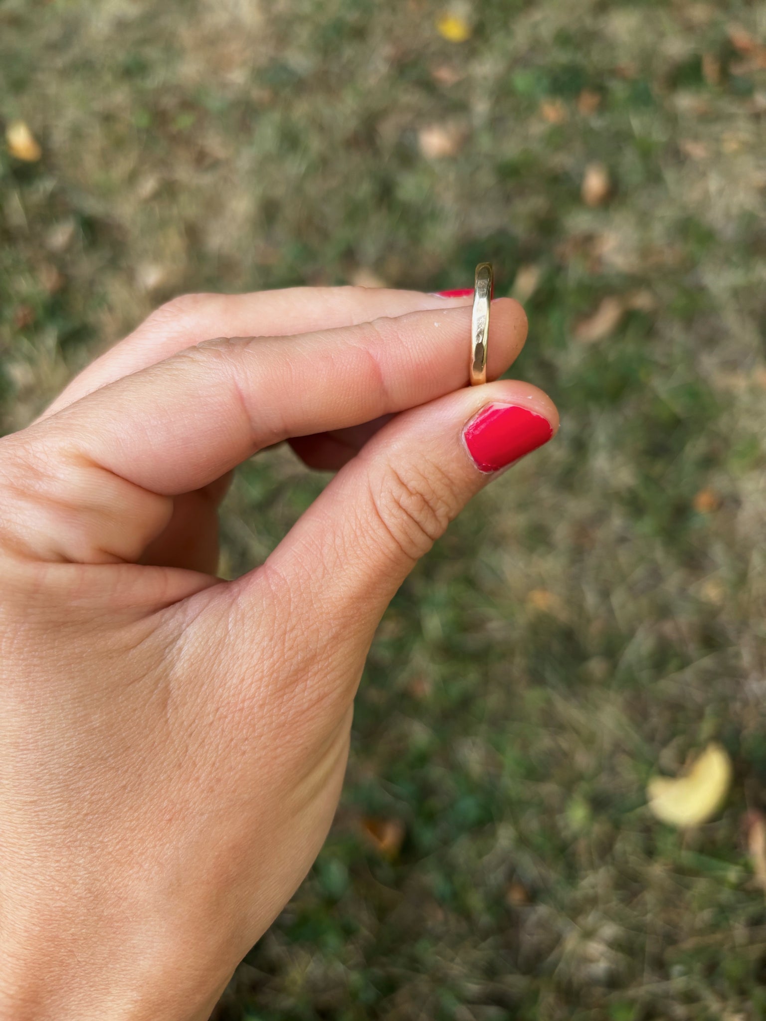 Dimensions: This stacker ring is size 8.75. It fits true to size. The band measures 2.5 mm in diameter.