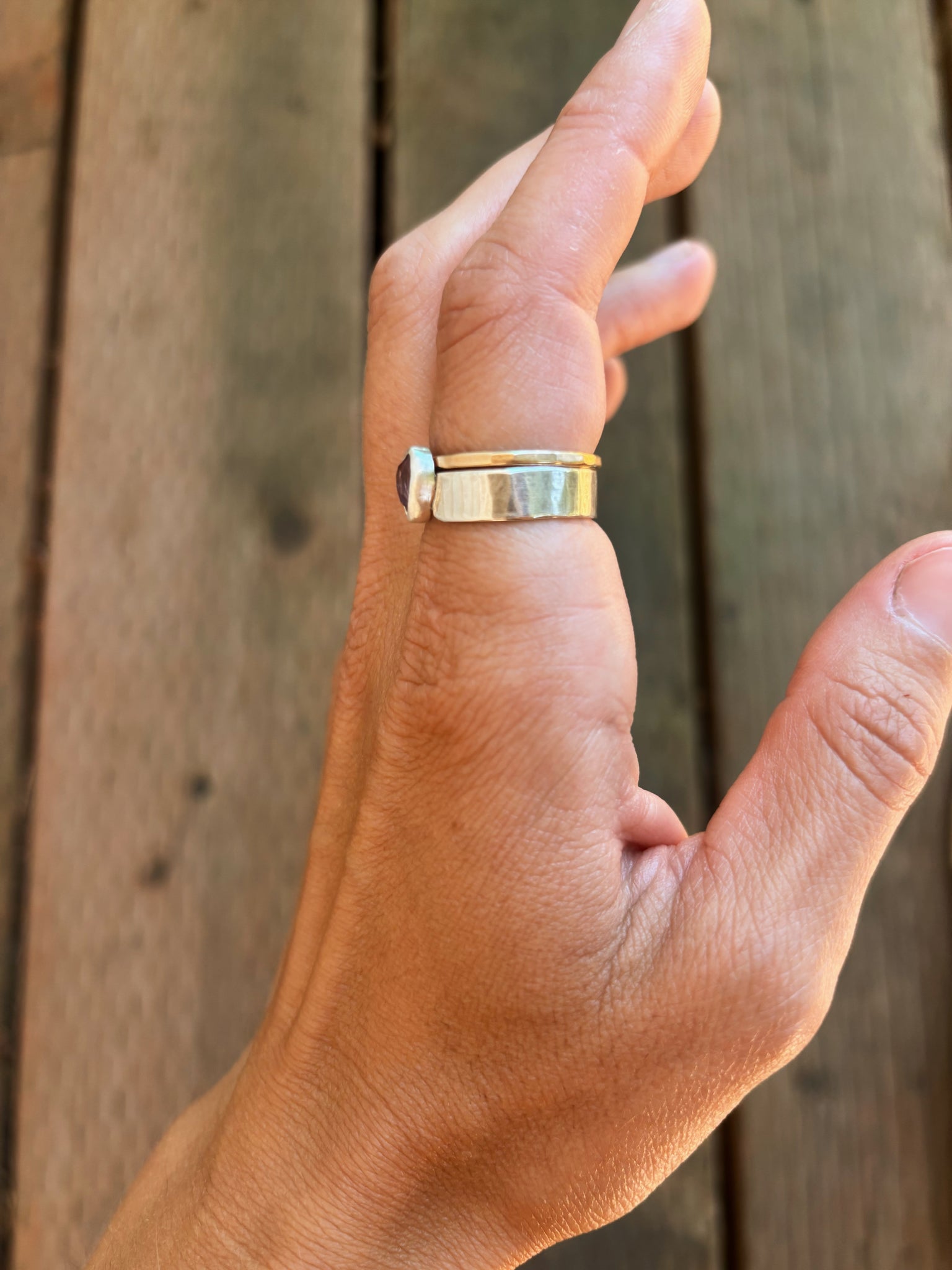 This little stacking set is petite, but so stunning. The ring set is crafted from sterling silver and features a light pink slice of facetted Spinel. The silver band is made from thick silver. Sitting atop the silver band is one 14 karat goldfill stacking ring. This stacking ring comes on and off and is not connected to the silver ring portion. The mixed metal compliments the pink stone so well. I love this piece so much!