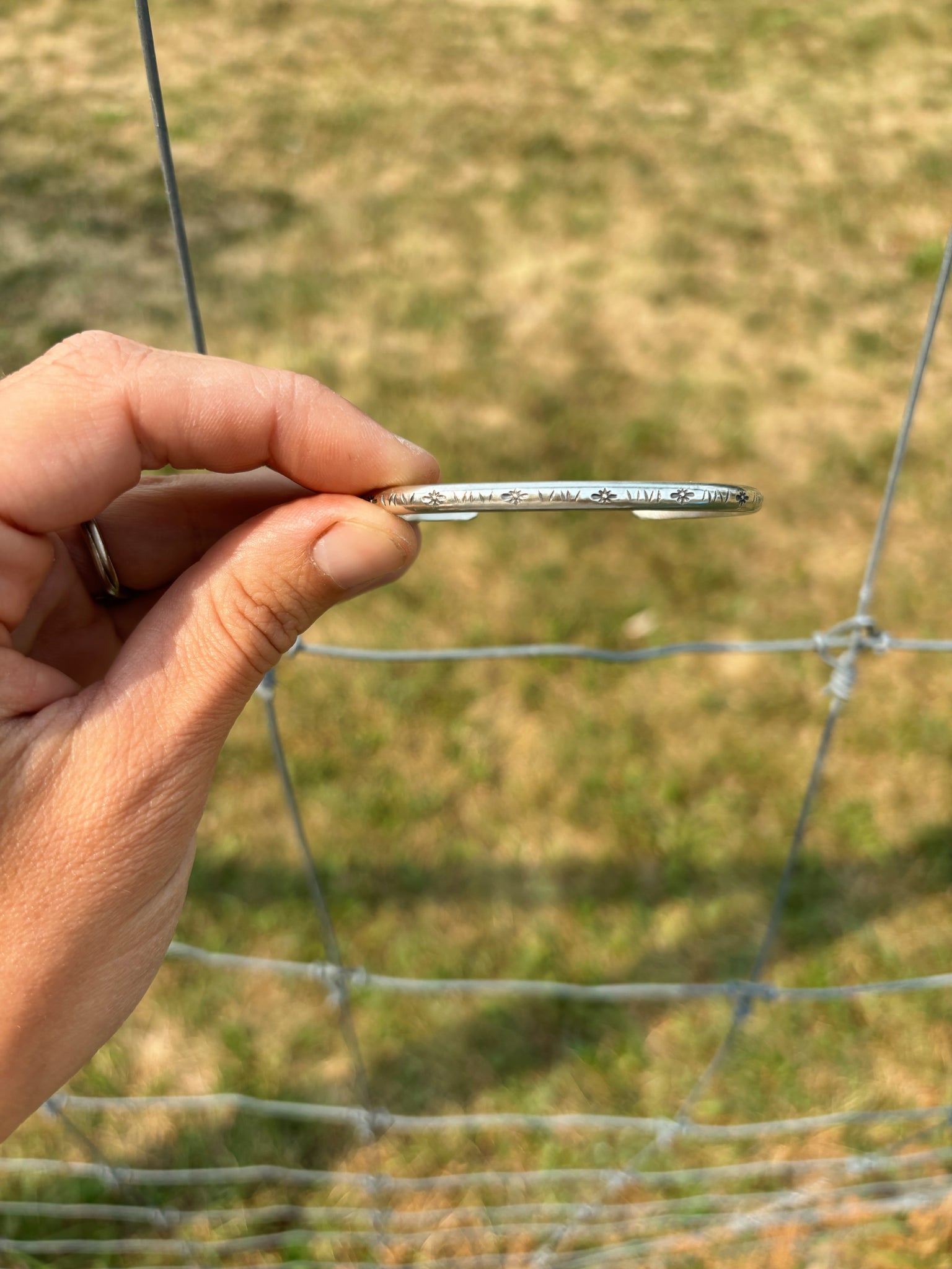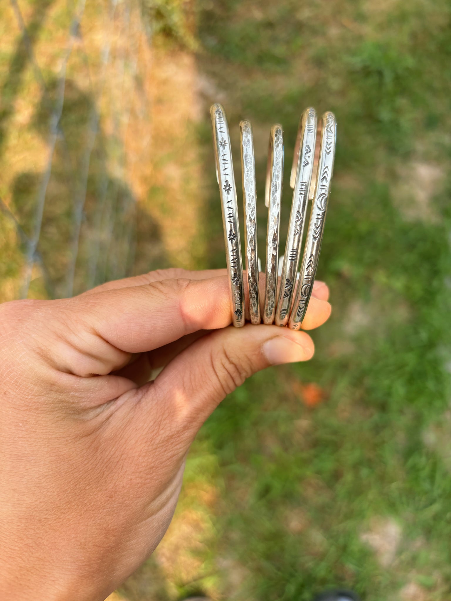 A Bad Rock staple- these stamp cuffs are some of my favorite everyday pieces. Each one is forged from thick half round sterling silver and feature unique stamping. This cuff has star stamps on it. measures between 2.25 and 2.5 inches in diameter and fits most wrists sizes S/M. Each cuff is semi adjustable so you can cinch it down once it's on.